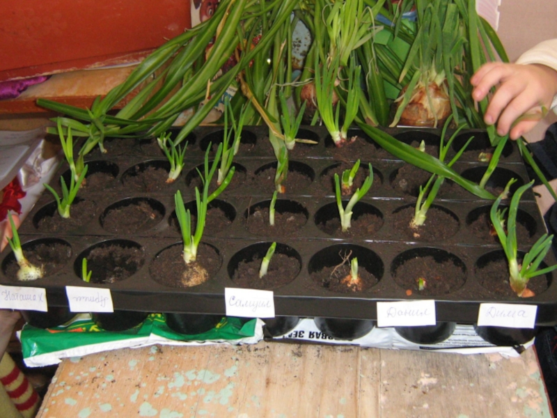 контейнерах полезное лекарственное растение –лук.Изготовлены таблички –указатели с названиями растения –лук. Посажены луковицы.