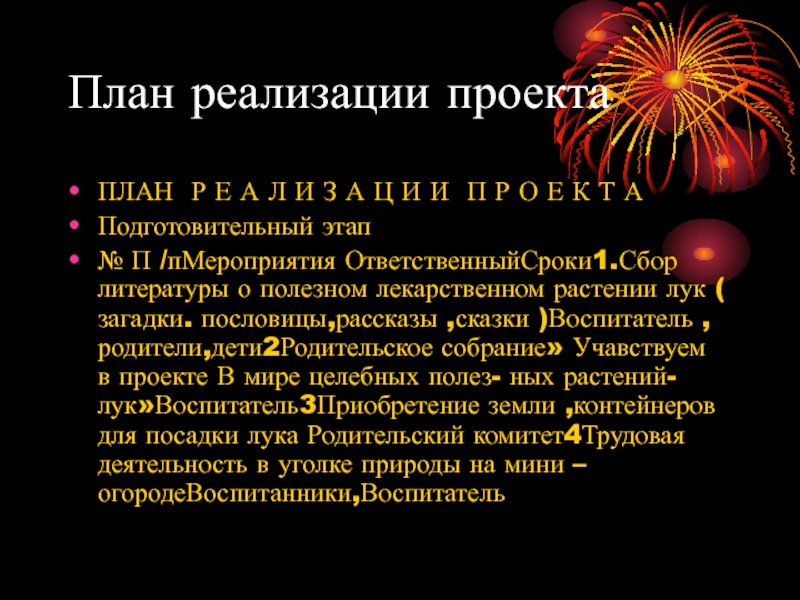 № П /пМероприятия ОтветственныйСроки1.Сбор литературы о полезном лекарственном растении лук ( загадки. пословицы,рассказы ,сказки )Воспитатель ,родители,дети2Родительское собрание» Учавствуем в проекте В мире целебных полез- ных растений-лук»Воспитатель3Приобретение земли ,контейнеров для посадки лука Родительский комитет4Трудовая деятельность в уголке природы на мини –огородеВоспитанники,Воспитатель