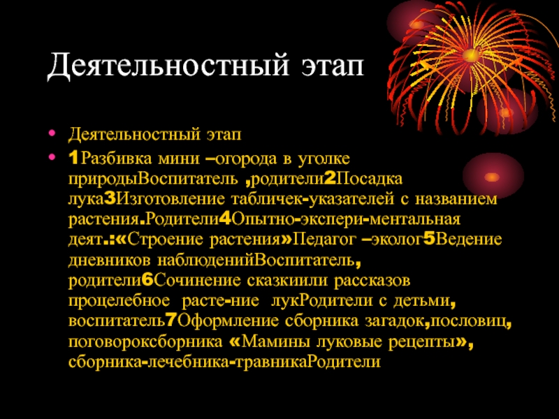 1Разбивка мини –огорода в уголке природыВоспитатель ,родители2Посадка лука3Изготовление табличек-указателей