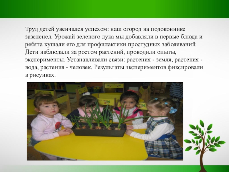 добавляли в первые блюда и ребята кушали его для профилактики простудных заболеваний. Дети наблюдали за ростом растений, проводили опыты, эксперименты. Устанавливали связи: растения - земля, растения - вода, растения - человек. Результаты экспериментов фиксировали в рисунках.