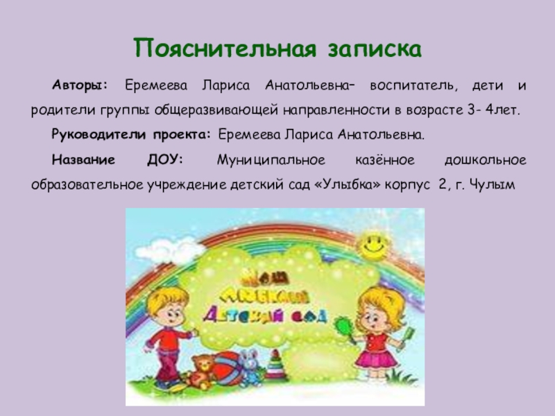 Название ДОУ: Муниципальное казённое дошкольное образовательное учреждение детский сад «Улыбка» корпус 2, г. Чулым