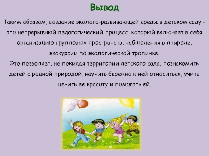 Таким образом, создание эколого-развивающей среды в детском саду - это непрерывный