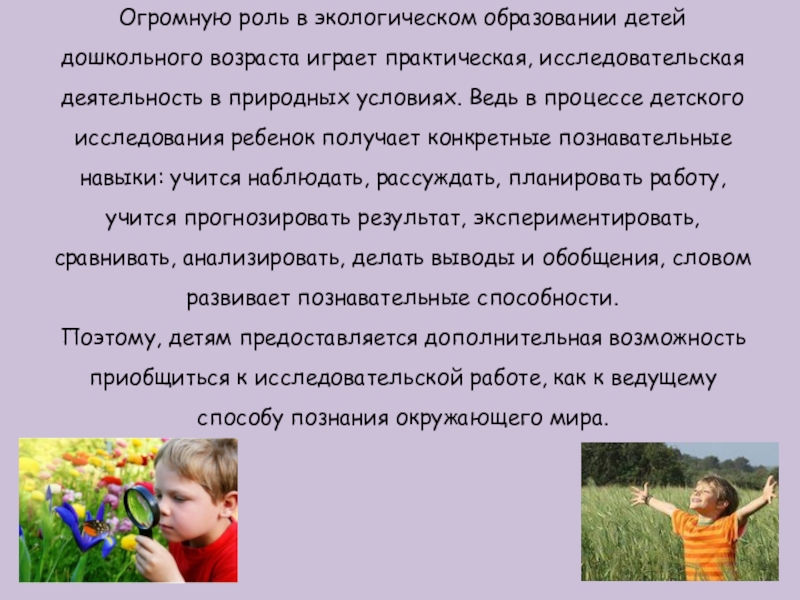 Слайд 9Огромную роль в экологическом образовании детей дошкольного возраста играет практическая, исследовательская