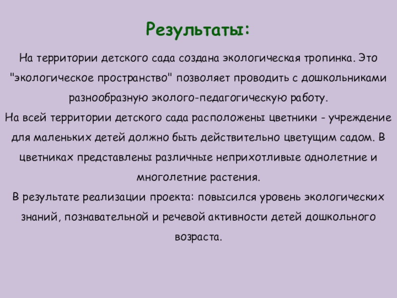 В результате реализации проекта: повысился уровень экологических знаний, познавательной и речевой активности детей дошкольного возраста.