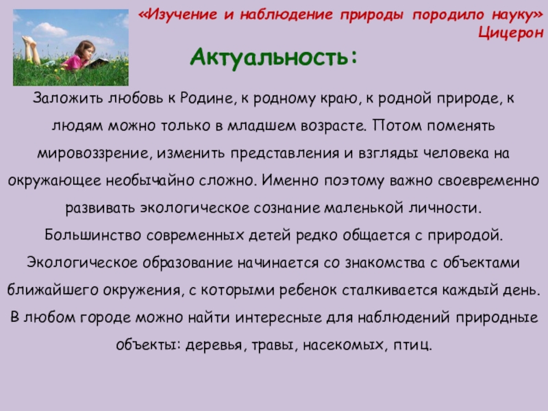 родному краю, к родной природе, к людям можно только в младшем возрасте. Потом поменять мировоззрение, изменить представления и взгляды человека на окружающее необычайно сложно. Именно поэтому важно своевременно развивать экологическое сознание маленькой личности.