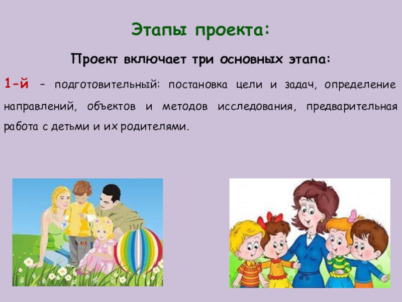задач, определение направлений, объектов и методов исследования, предварительная работа с детьми и их родителями.