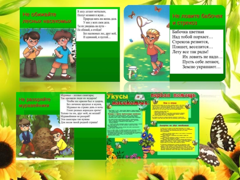 дошкольников приобретает особую остроту и актуальность. Современные дети в силу своей чрезмерной активности самостоятельно не всегда могут найти ответ на интересующие их вопросы. Интерес их неустойчив. Познавательная активность чаще всего непроизвольная. Поэтому взрослым необходимо создать условия, для того чтобы сформировать навыки правильного поведения детей в природе. Чтобы дети не губили насекомых, варварски уничтожая их, необходимо помочь им понять своеобразие каждого насекомого его уникальность и ценность на земле. Осознанно-правильное отношение детей к природе строится на чувственном ее восприятии, эмоциональном отношении к ней и знании особенностей жизни, роста и развития отдельных живых существ. Такие знания в процессе общения ребенка с природой обеспечивают ему понимание конкретных ситуаций в поведении насекомых, правильную их оценку и адекватное реагирование.