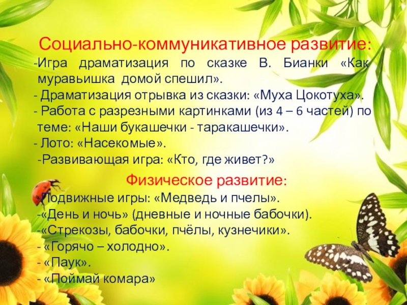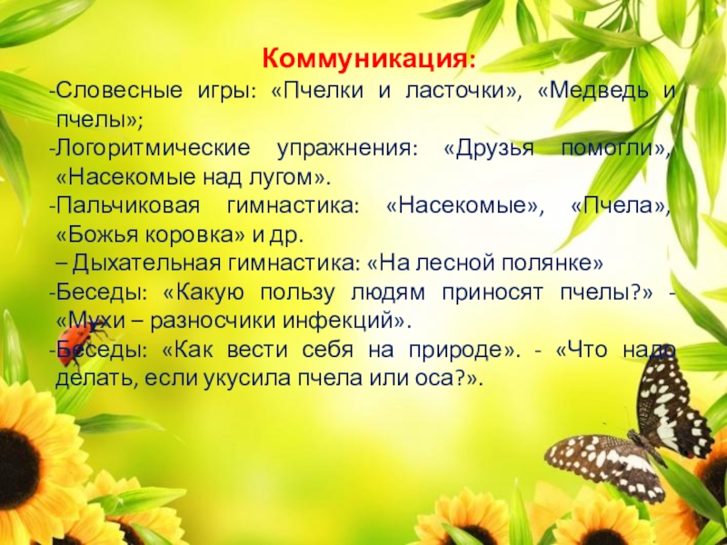 Дидактические игры: «Отгадай насекомое», «Собери цветок»,
