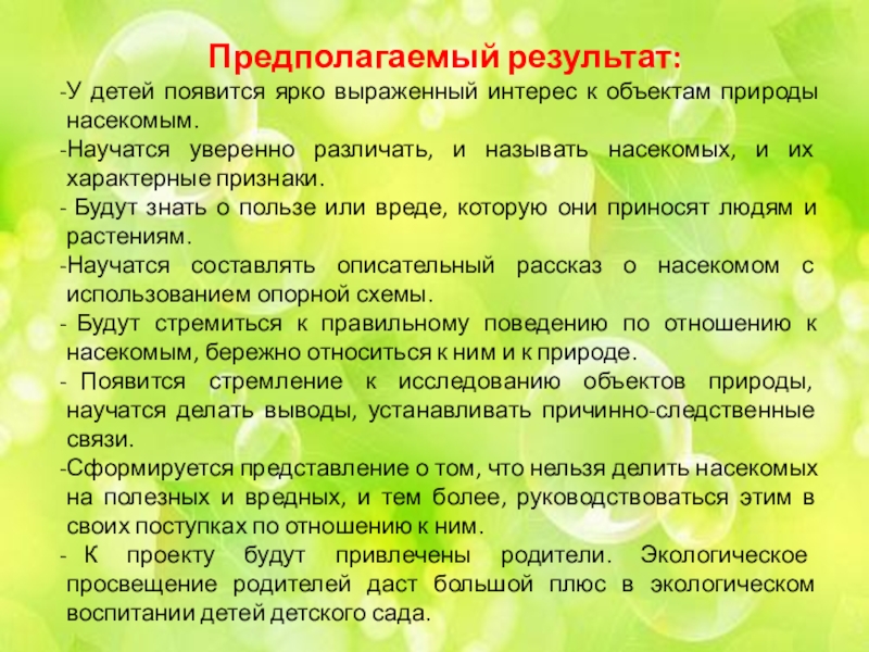 Сформируется представление о том, что нельзя делить насекомых на полезных и вредных, и тем более, руководствоваться этим в своих поступках по отношению к ним.