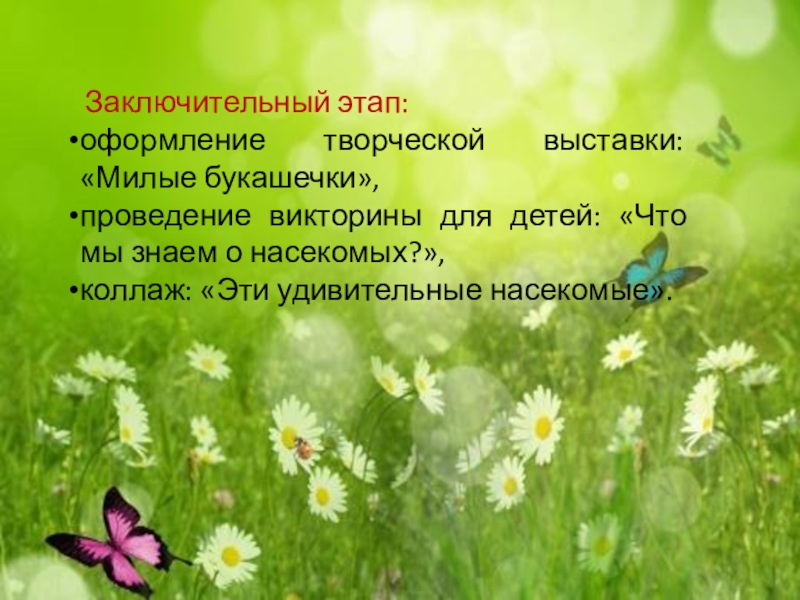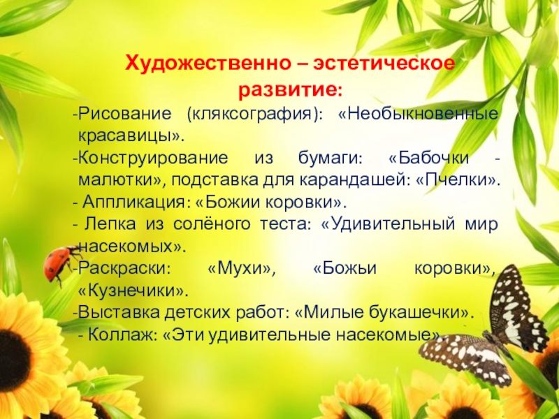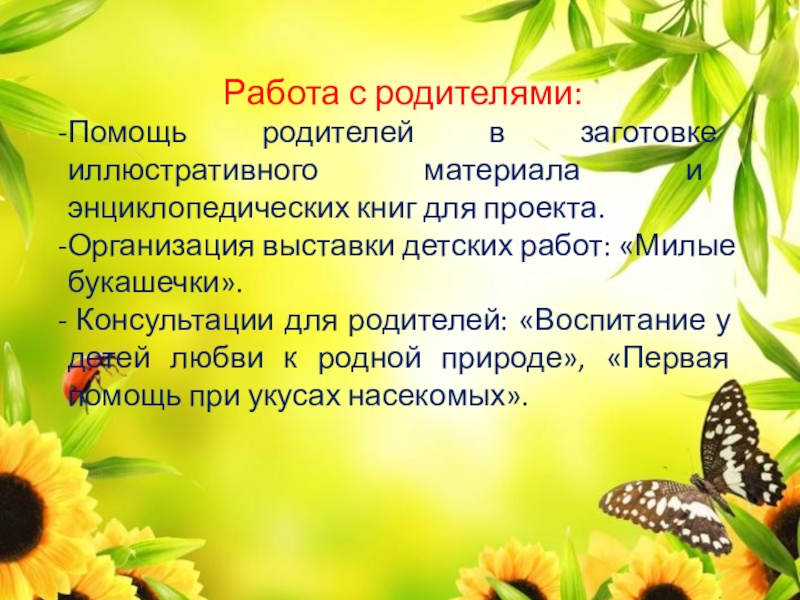 Работа с родителями: привлечение родителей к подбору иллюстративного материала и энциклопедических книг вместе с детьми; организация выставки детских работ «Милые букашечки», консультация на тему: «Воспитание у детей любви к родной природе», изготовление фотоальбома о насекомых.