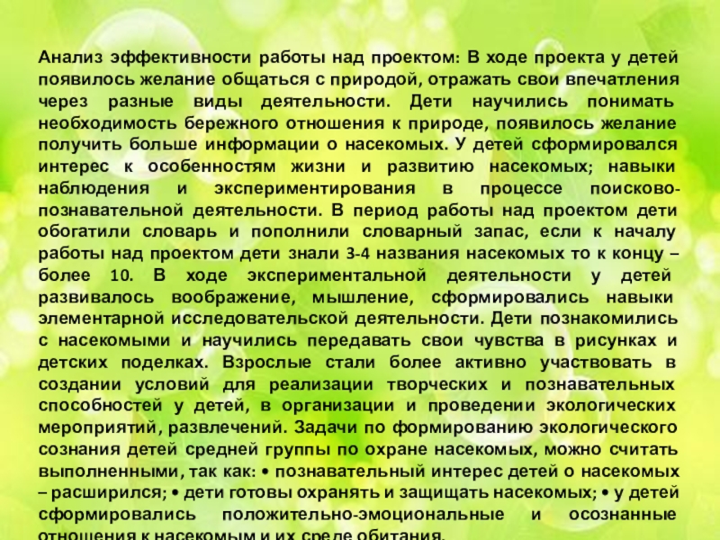желание общаться с природой, отражать свои впечатления через разные виды деятельности. Дети научились понимать необходимость бережного отношения к природе, появилось желание получить больше информации о насекомых. У детей сформировался интерес к особенностям жизни и развитию насекомых; навыки наблюдения и экспериментирования в процессе поисково-познавательной деятельности. В период работы над проектом дети обогатили словарь и пополнили словарный запас, если к началу работы над проектом дети знали 3-4 названия насекомых то к концу – более 10. В ходе экспериментальной деятельности у детей развивалось воображение, мышление, сформировались навыки элементарной исследовательской деятельности. Дети познакомились с насекомыми и научились передавать свои чувства в рисунках и детских поделках. Взрослые стали более активно участвовать в создании условий для реализации творческих и познавательных способностей у детей, в организации и проведении экологических мероприятий, развлечений. Задачи по формированию экологического сознания детей средней группы по охране насекомых, можно считать выполненными, так как: • познавательный интерес детей о насекомых – расширился; • дети готовы охранять и защищать насекомых; • у детей сформировались положительно-эмоциональные и осознанные отношения к насекомым и их среде обитания.