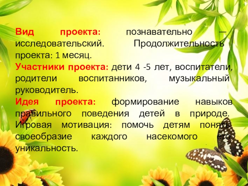 Идея проекта: формирование навыков правильного поведения детей в природе. Игровая мотивация: помочь детям понять своеобразие каждого насекомого его уникальность.