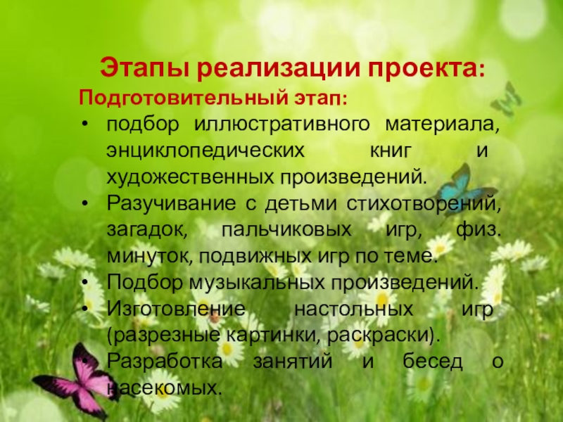 Слайд 3Цель проекта: формирование у детей представлений о жизни насекомых, гуманное отношение