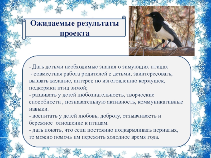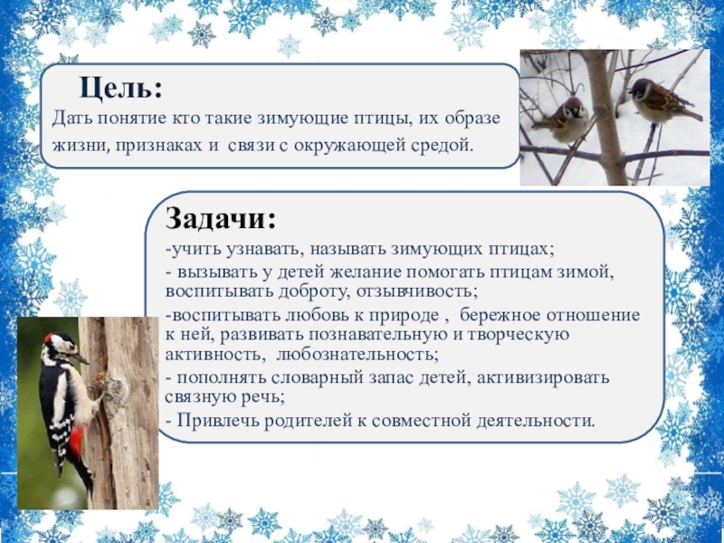 - вызывать у детей желание помогать птицам зимой, воспитывать доброту, отзывчивость;