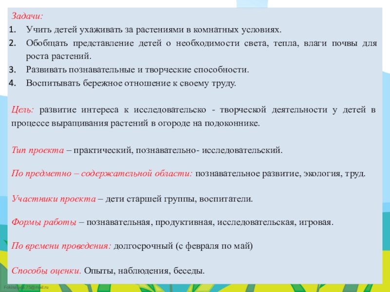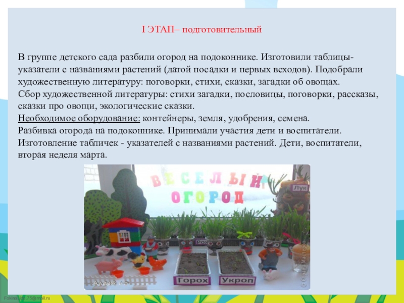 Цель: развитие интереса к исследовательско - творческой деятельности у детей в процессе выращивания растений в огороде на подоконнике.