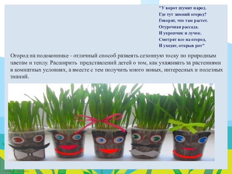 Огород на подоконнике - отличный способ развеять сезонную тоску по природным цветам и теплу. Расширить представлений детей о том, как ухаживать за растениями в комнатных условиях, а вместе с тем получить много новых, интересных и полезных знаний.