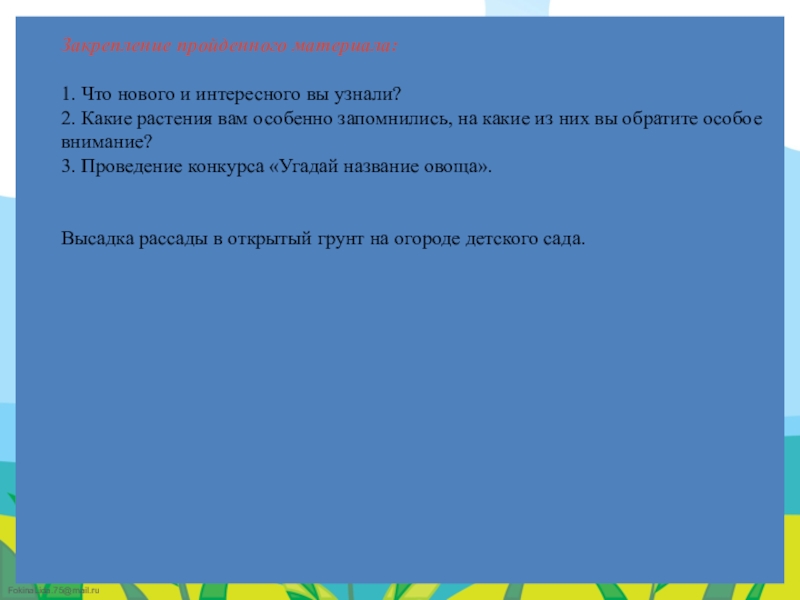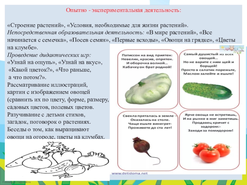 таблицы-указатели с названиями растений (датой посадки и первых всходов). Подобрали художественную литературу: поговорки, стихи, сказки, загадки об овощах.