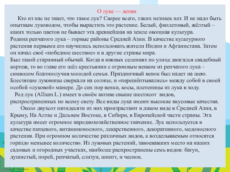 Слайд 9О луке — детям