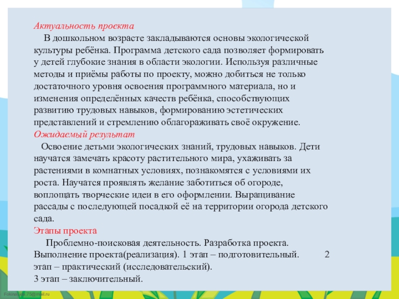 Программа детского сада позволяет формировать у детей глубокие знания в области экологии. Используя различные методы и приёмы работы по проекту, можно добиться не только достаточного уровня освоения программного материала, но и изменения определённых качеств ребёнка, способствующих развитию трудовых навыков, формированию эстетических представлений и стремлению облагораживать своё окружение.