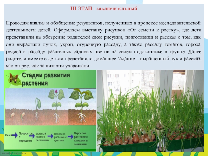исследовательской деятельности детей. Оформляем выставку рисунков «От семени к ростку», где дети представили на обозрение родителей свои рисунки, подготовили и рассказ о том, как они вырастили лучок, укроп, огуречную рассаду, а также рассаду томатов, гороха редиса и рассаду различных садовых цветов на своем подоконнике в группе. Далее родители вместе с детьми представили домашнее задание – выращенный лук и рассказ, как он рос, как за ним они ухаживали.