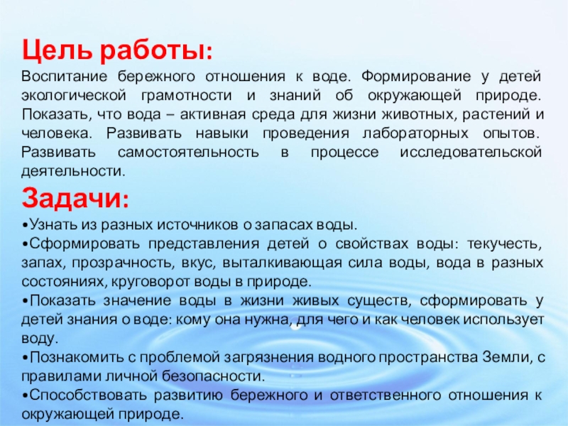 •Показать значение воды в жизни живых существ, сформировать у детей знания о воде: кому она нужна, для чего и как человек использует воду.