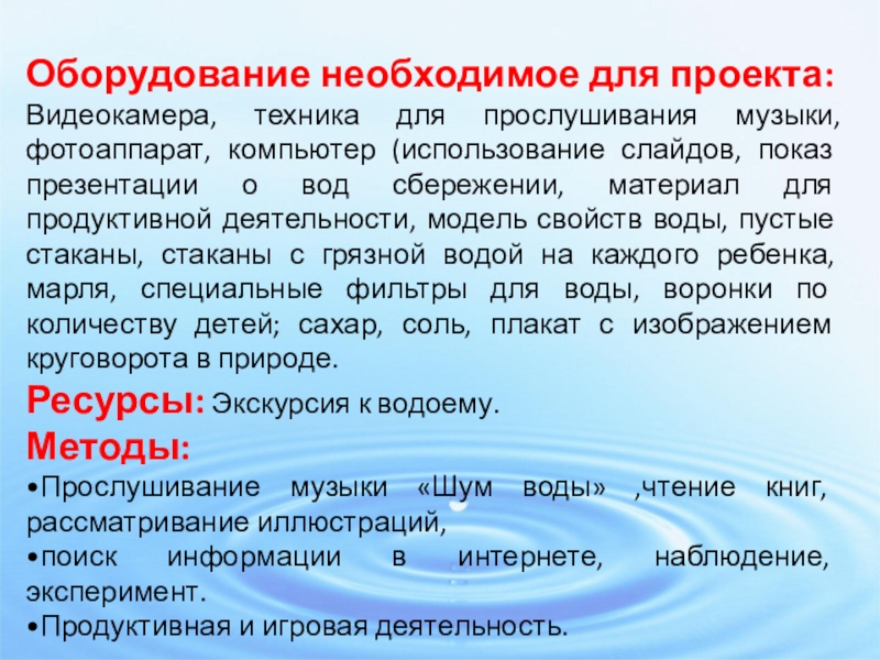 слайдов, показ презентации о вод сбережении, материал для продуктивной деятельности, модель свойств воды, пустые стаканы, стаканы с грязной водой на каждого ребенка, марля, специальные фильтры для воды, воронки по количеству детей; сахар, соль, плакат с изображением круговорота в природе.