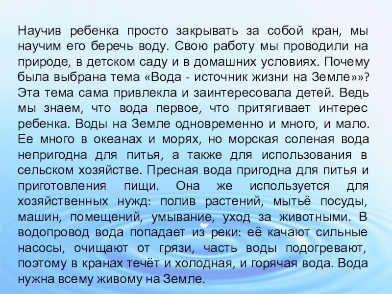 воду. Свою работу мы проводили на природе, в детском саду и в домашних условиях. Почему была выбрана тема «Вода - источник жизни на Земле»»? Эта тема сама привлекла и заинтересовала детей. Ведь мы знаем, что вода первое, что притягивает интерес ребенка. Воды на Земле одновременно и много, и мало. Ее много в океанах и морях, но морская соленая вода непригодна для питья, а также для использования в сельском хозяйстве. Пресная вода пригодна для питья и приготовления пищи. Она же используется для хозяйственных нужд: полив растений, мытьё посуды, машин, помещений, умывание, уход за животными. В водопровод вода попадает из реки: её качают сильные насосы, очищают от грязи, часть воды подогревают, поэтому в кранах течёт и холодная, и горячая вода. Вода нужна всему живому на Земле.