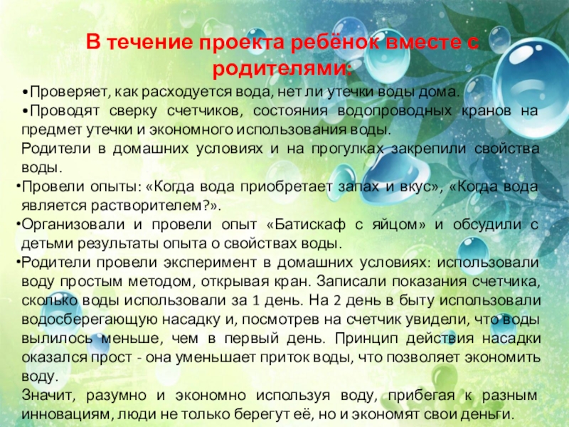 Родители провели эксперимент в домашних условиях: использовали воду простым методом, открывая кран. Записали показания счетчика, сколько воды использовали за 1 день. На 2 день в быту использовали водосберегающую насадку и, посмотрев на счетчик увидели, что воды вылилось меньше, чем в первый день. Принцип действия насадки оказался прост - она уменьшает приток воды, что позволяет экономить воду.