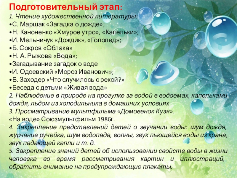 Знакомит детей с познавательными и художественными произведениями о воде, её свойствах, о значении и использовании воды в жизни всего живого на земле.
