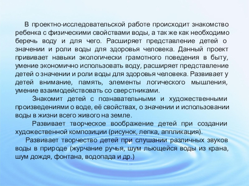 воды, а так же как необходимо беречь воду и для чего. Расширяет представление детей о значении и роли воды для здоровья человека. Данный проект прививает навыки экологически грамотного поведения в быту, умение экономично использовать воду, расширяет представление детей о значении и роли воды для здоровья человека. Развивает у детей внимание, память, элементы логического мышления, умение взаимодействовать со сверстниками.