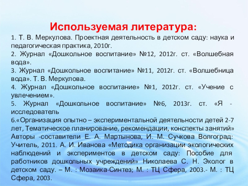3. Журнал «Дошкольное воспитание» №11, 2012г. ст. «Волшебница вода». Т. В. Меркулова.