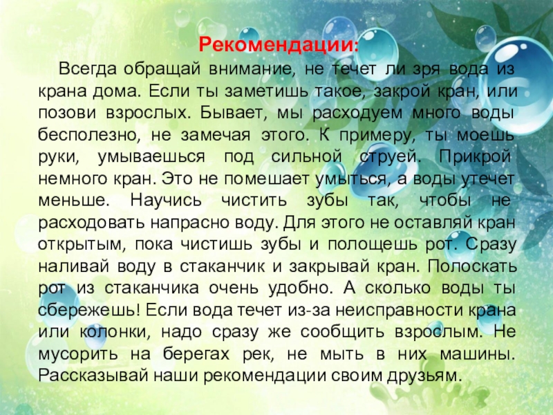 крана дома. Если ты заметишь такое, закрой кран, или позови взрослых. Бывает, мы расходуем много воды бесполезно, не замечая этого. К примеру, ты моешь руки, умываешься под сильной струей. Прикрой немного кран. Это не помешает умыться, а воды утечет меньше. Научись чистить зубы так, чтобы не расходовать напрасно воду. Для этого не оставляй кран открытым, пока чистишь зубы и полощешь рот. Сразу наливай воду в стаканчик и закрывай кран. Полоскать рот из стаканчика очень удобно. А сколько воды ты сбережешь! Если вода течет из-за неисправности крана или колонки, надо сразу же сообщить взрослым. Не мусорить на берегах рек, не мыть в них машины. Рассказывай наши рекомендации своим друзьям.