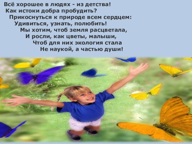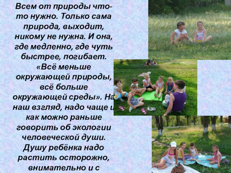 нужна. И она, где медленно, где чуть быстрее, погибает. «Всё меньше окружающей природы, всё больше окружающей среды». На наш взгляд, надо чаще и как можно раньше говорить об экологии человеческой души. Душу ребёнка надо растить осторожно, внимательно и с любовью.