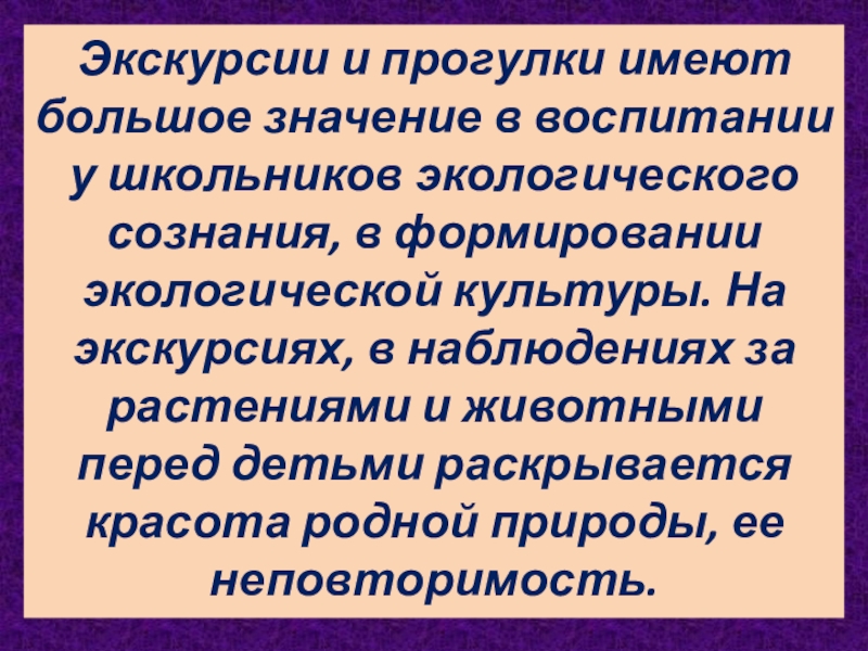 Слайд 7Экскурсии и прогулки имеют большое значение в воспитании у школьников экологического