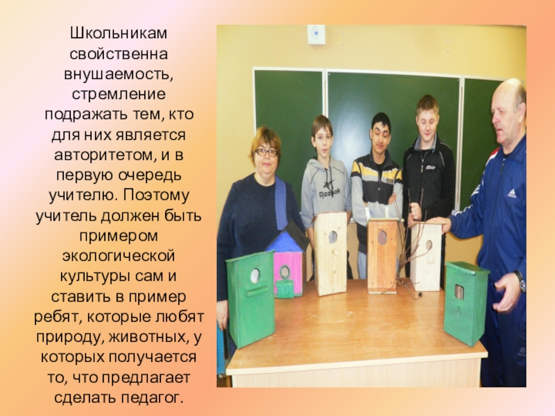 и в первую очередь учителю. Поэтому учитель должен быть примером экологической культуры сам и ставить в пример ребят, которые любят природу, животных, у которых получается то, что предлагает сделать педагог.
