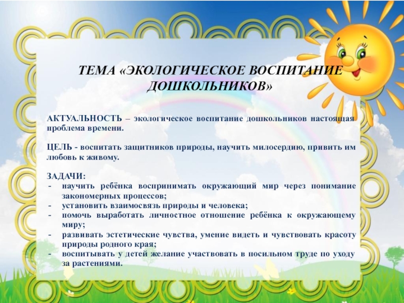 ТЕМА «ЭКОЛОГИЧЕСКОЕ ВОСПИТАНИЕ ДОШКОЛЬНИКОВ»АКТУАЛЬНОСТЬ – экологическое воспитание дошкольников настоящая проблема времени.ЦЕЛЬ - воспитать защитников природы, научить милосердию,