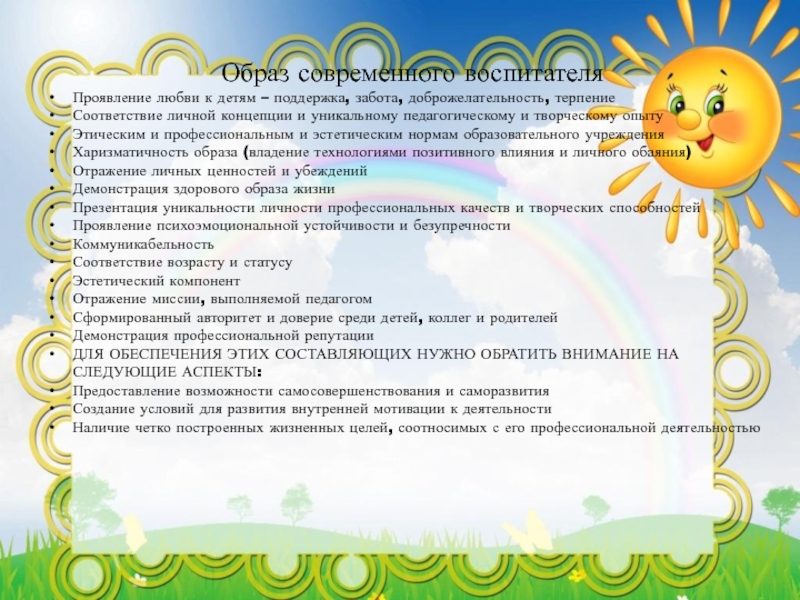 Образ современного воспитателяПроявление любви к детям – поддержка, забота, доброжелательность, терпениеСоответствие личной концепции и уникальному педагогическому