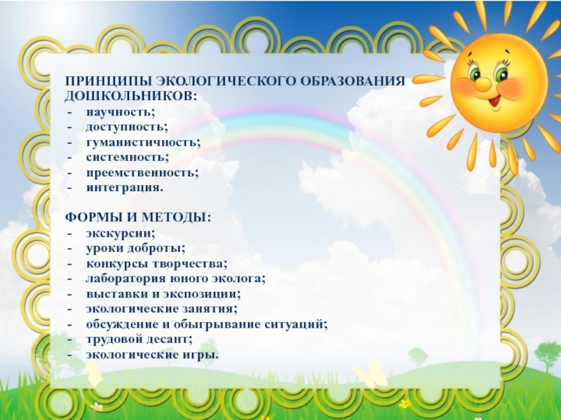 ПРИНЦИПЫ ЭКОЛОГИЧЕСКОГО ОБРАЗОВАНИЯ ДОШКОЛЬНИКОВ:научность;доступность;гуманистичность;системность;преемственность;интеграция.ФОРМЫ И МЕТОДЫ:экскурсии;уроки доброты;конкурсы творчества;лаборатория юного эколога;выставки и экспозиции;экологические занятия;обсуждение и обыгрывание ситуаций;трудовой десант;экологические