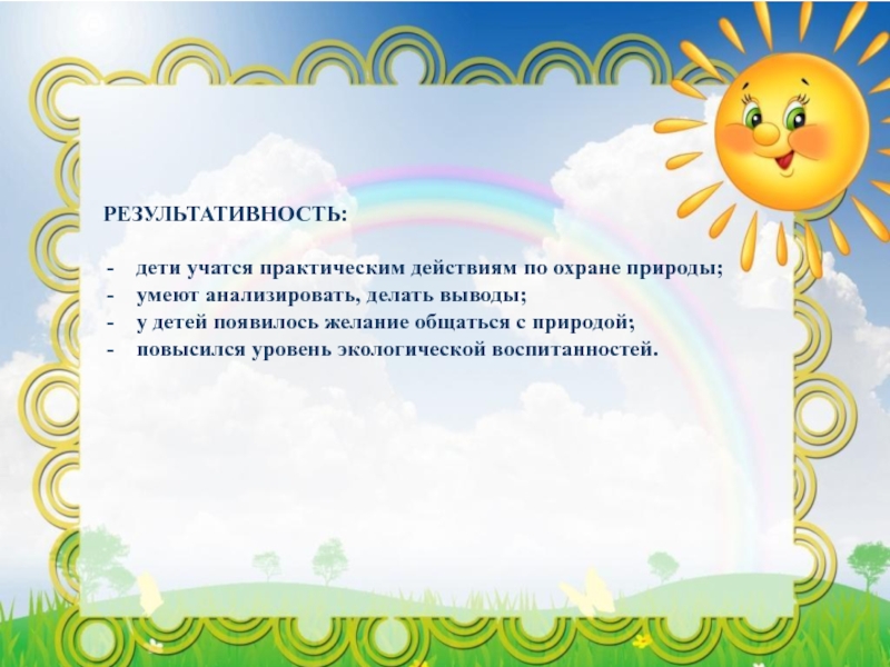 РЕЗУЛЬТАТИВНОСТЬ:дети учатся практическим действиям по охране природы;умеют анализировать, делать выводы;у детей появилось желание общаться с природой;повысился уровень