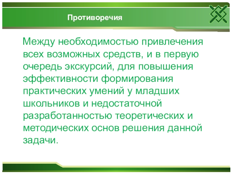 Между необходимостью привлечения всех возможных средств, и в первую очередь экскурсий, для повышения эффективности формирования практических умений у младших школьников и недостаточной разработанностью теоретических и методических основ решения данной задачи.