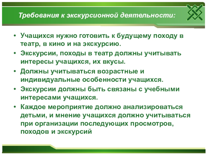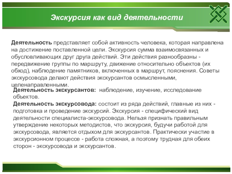 Деятельность представляет собой активность человека, которая направлена на достижение поставленной цели. Экскурсия сумма взаимосвязанных и обусловливающих друг друга действий. Эти действия разнообразны - передвижение группы по маршруту, движение относительно объектов (их обход), наблюдение памятников, включенных в маршрут, пояснения. Советы экскурсовода делают действия экскурсантов осмысленными, целенаправленными.