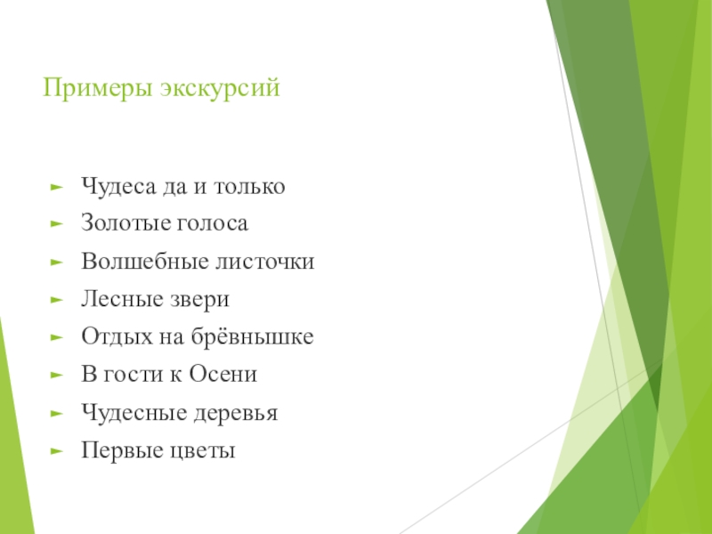 Примеры экскурсийЧудеса да и толькоЗолотые голосаВолшебные листочкиЛесные звериОтдых на брёвнышкеВ гости к ОсениЧудесные деревьяПервые цветы