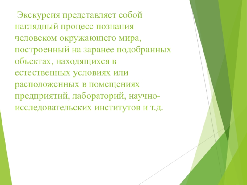 Слайд 2 Экскурсия представляет собой наглядный процесс познания человеком окружающего мира, построенный