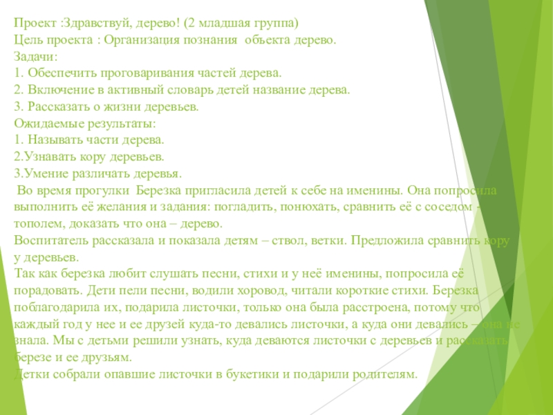 Проект :Здравствуй, дерево! (2 младшая группа) Цель проекта : Организация познания объекта дерево.  Задачи: 1. Обеспечить проговаривания