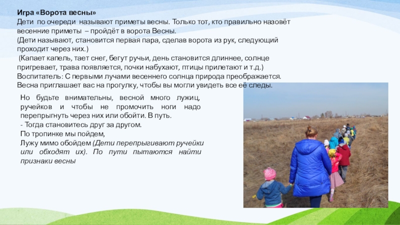 Дети по очереди называют приметы весны. Только тот, кто правильно назовёт весенние приметы – пройдёт в ворота Весны.