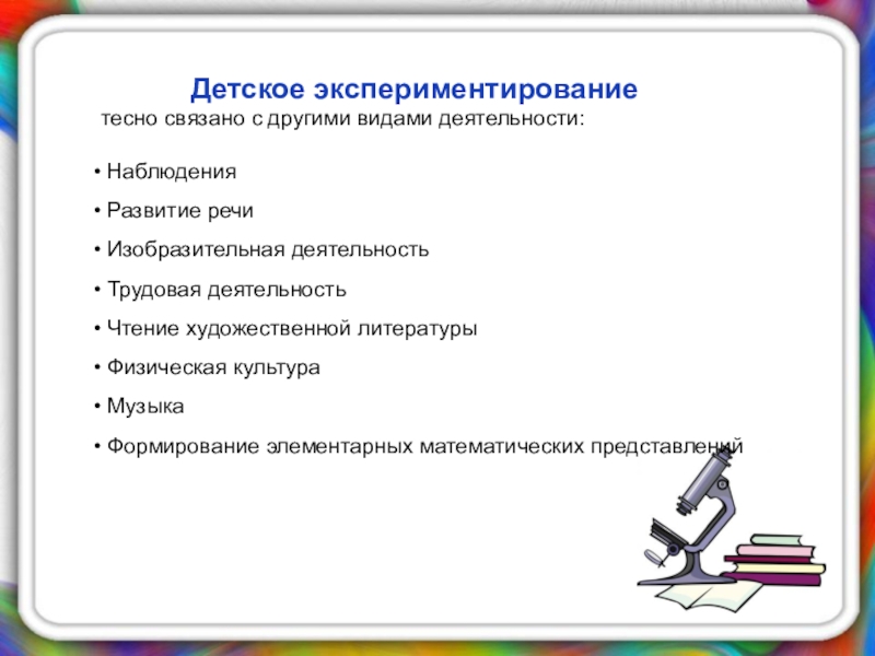 Детское экспериментирование тесно связано с другими видами деятельности: Наблюдения Развитие речи