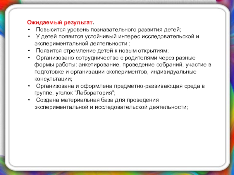 Ожидаемый результат. Повысится уровень познавательного развития детей; У детей появится устойчивый интерес исследовательской и экспериментальной деятельности ;