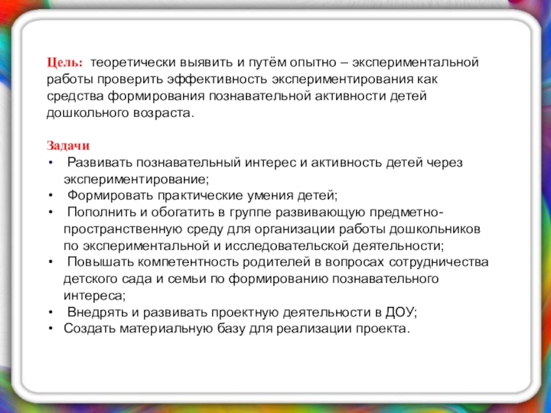Цель:  теоретически выявить и путём опытно – экспериментальной работы проверить эффективность экспериментирования как средства формирования познавательной активности