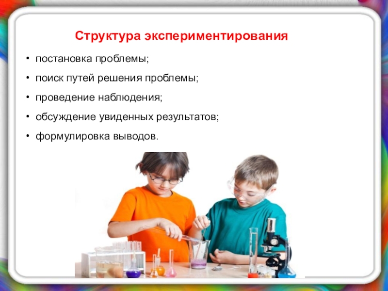 Структура экспериментирования постановка проблемы; поиск путей решения проблемы; проведение наблюдения; обсуждение увиденных результатов; формулировка выводов.