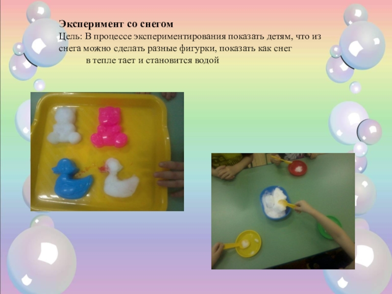 Цель: В процессе экспериментирования показать детям, что из снега можно сделать разные фигурки, показать как снег